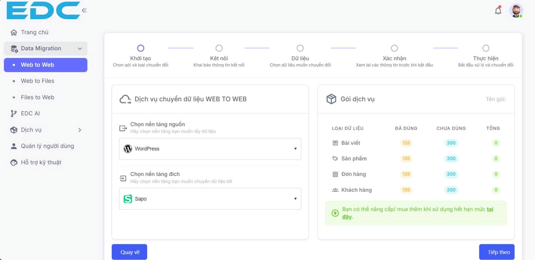 | Bài viết, sản phẩm, đơn hàng, Khách hàng cần di chuyển đến từng danh mục của website đích. | Chuyển thử dữ liệu để xem cách thức hoạt động, kết quả, tiến đến di chuyển toàn diện. |