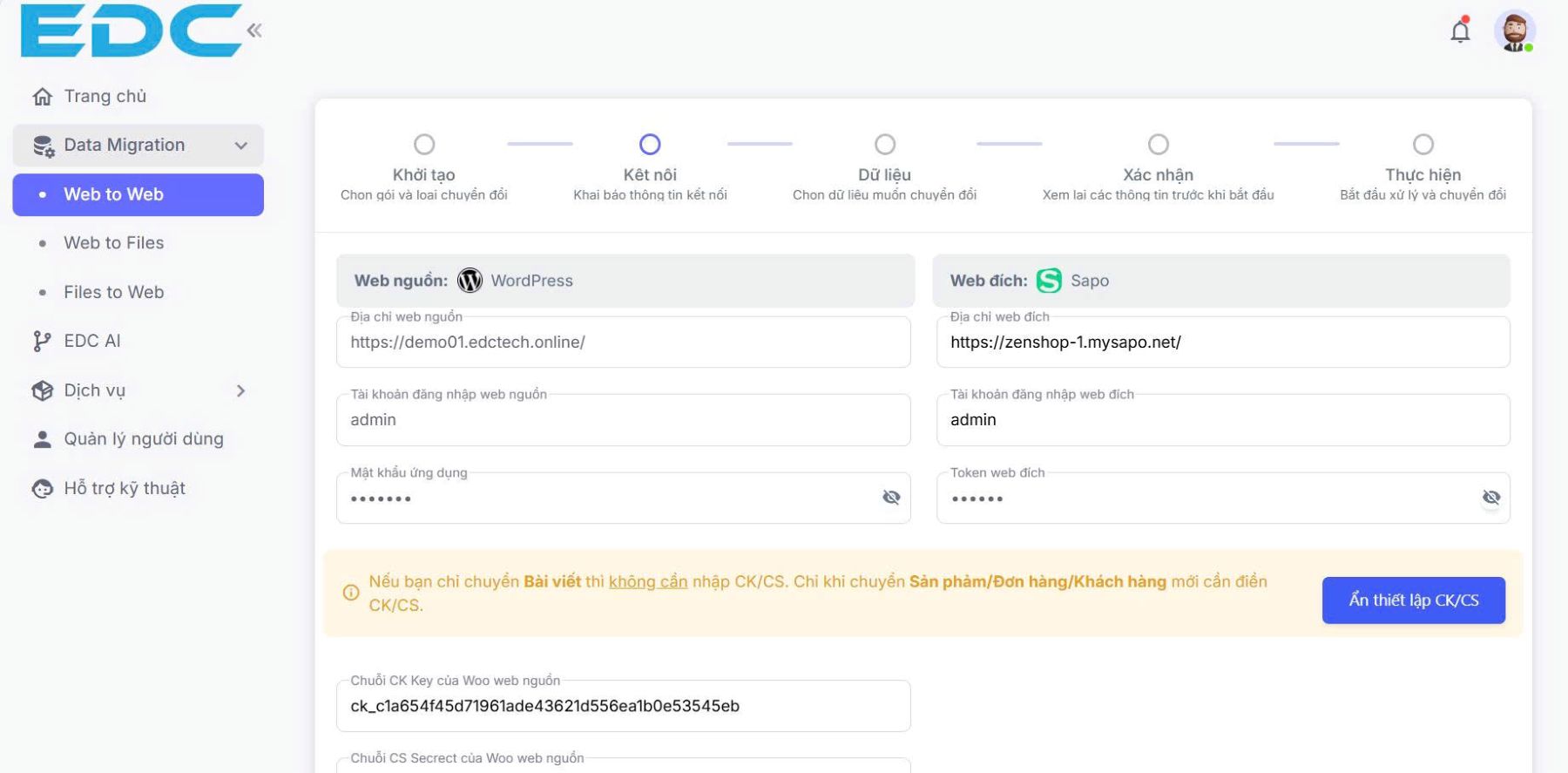 | Chọn 1 trong 3 phân hệ: Web to Web, File to Web, Web to File. | Nhập thông tin dữ liệu nguồn và đích, khóa bảo mật để kết nối. |