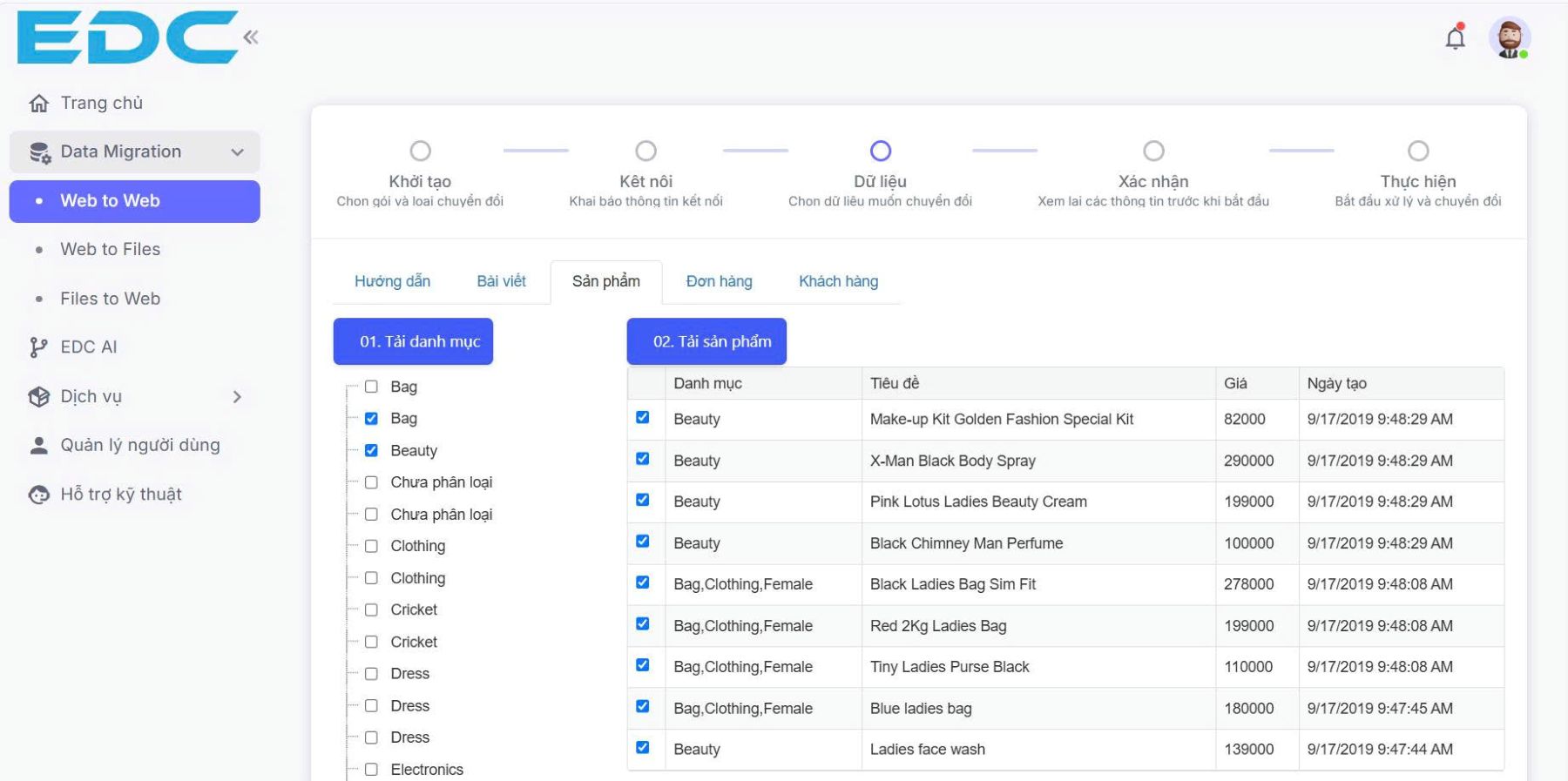 Data Migration: Giải pháp tự động hóa di chuyển dữ liệu (Sản phẩm, Đơn hàng, Khách hàng, Bài viết) giữa các nền tảng website và thương mại điện tử và các định dạng files qua lại với nhau giúp Doanh nghiệp tiết kiệm 90% thời gian hoàn thiện dữ liệu.