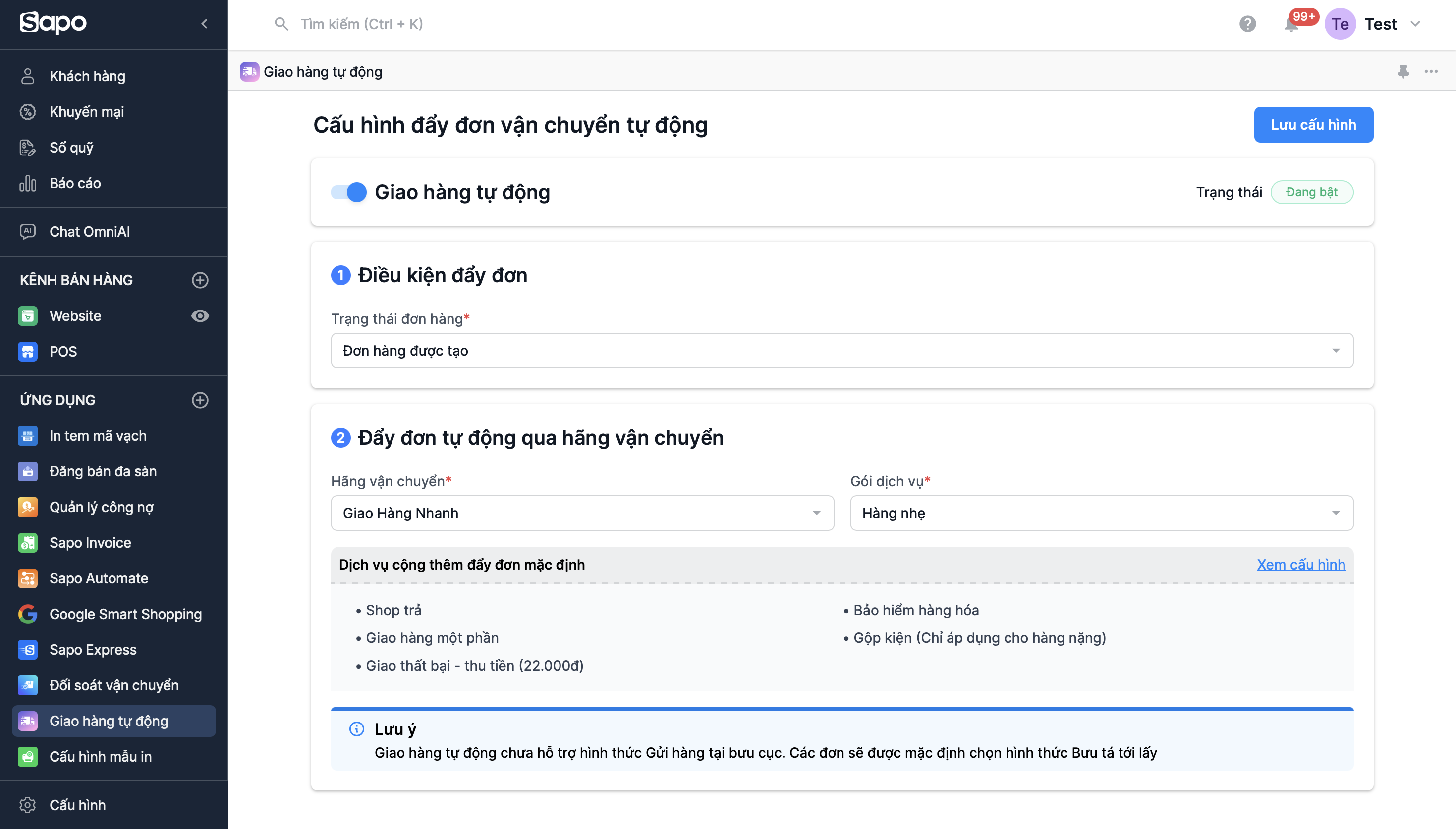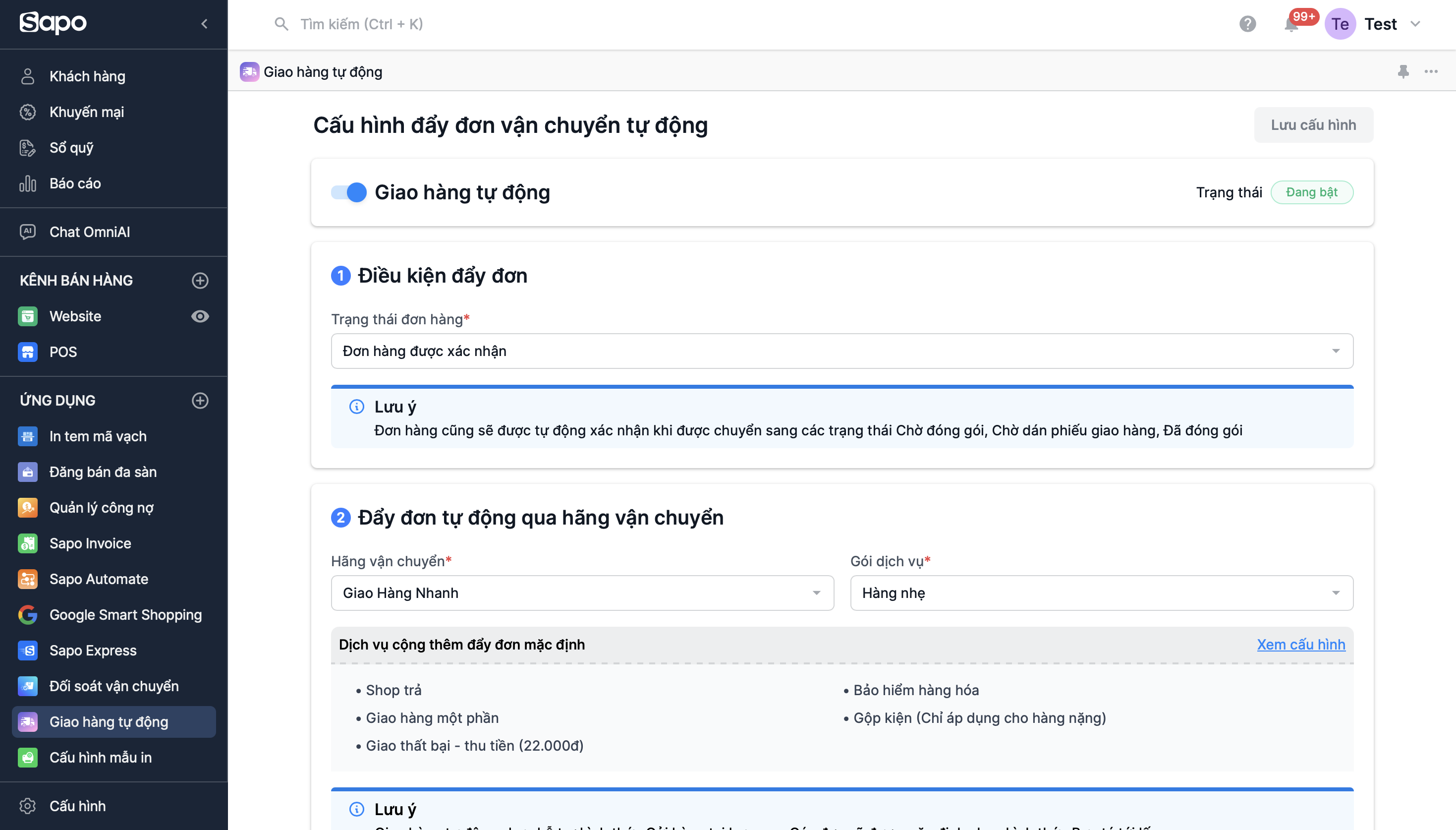Tính năng Giao hàng tự động trên Sapo giúp chủ shop và nhân viên không cần thao tác thủ công mỗi khi có đơn mới. Khi đơn hàng được tạo hoặc chuyển sang trạng thái được xác nhận, hệ thống sẽ tự động kết nối với đơn vị vận chuyển được cấu hình sẵn, tạo vận đơn và cập nhật mã vận đơn vào chi tiết đơn hàng.